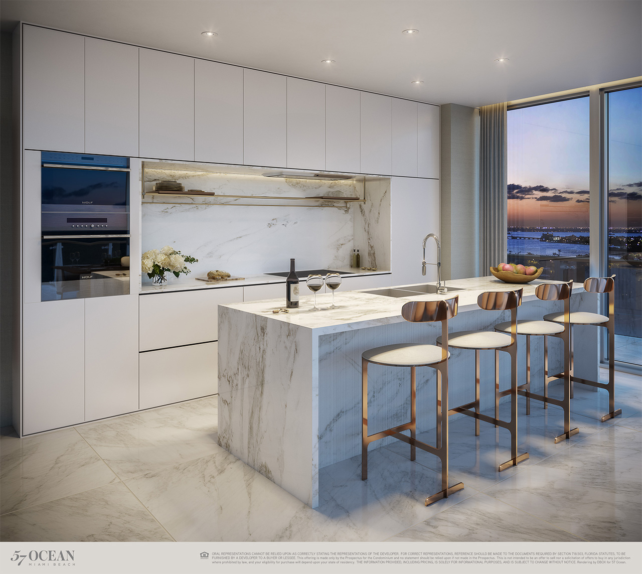 Designed by acclaimed architectural firm Arquitectonica, 57 Ocean is an 18-story oceanfront condo building situated along the pristine beaches of the Atlantic Ocean in Miami Beach. 57 Ocean consists of 69 luxury condos offering 2, 3 and 4-bedroom layouts ranging in size from 1,245 to 3,623 square feet under air and a trophy penthouse offering a private rooftop pool and summer kitchen with 15,000 sq/ft of total space that include 7,855 under air. Condos at 57 Ocean feature panoramic ocean and city views, 10-foot ceilings, dramatic floor-to-ceiling impact-resistant windows/doors, gourmet Italian kitchens by Poliform featuring solid marble countertops/backsplashes, waterfall island and Sub-Zero/Wolf appliance, spa-like Italian master bathrooms by Poliform offering Italian fixtures, natural stone flooring/wet walls, dual-sink vanities, floating tubs & double spa showers and expansive 12-foot deep private terraces with wood-like ceiling accents.