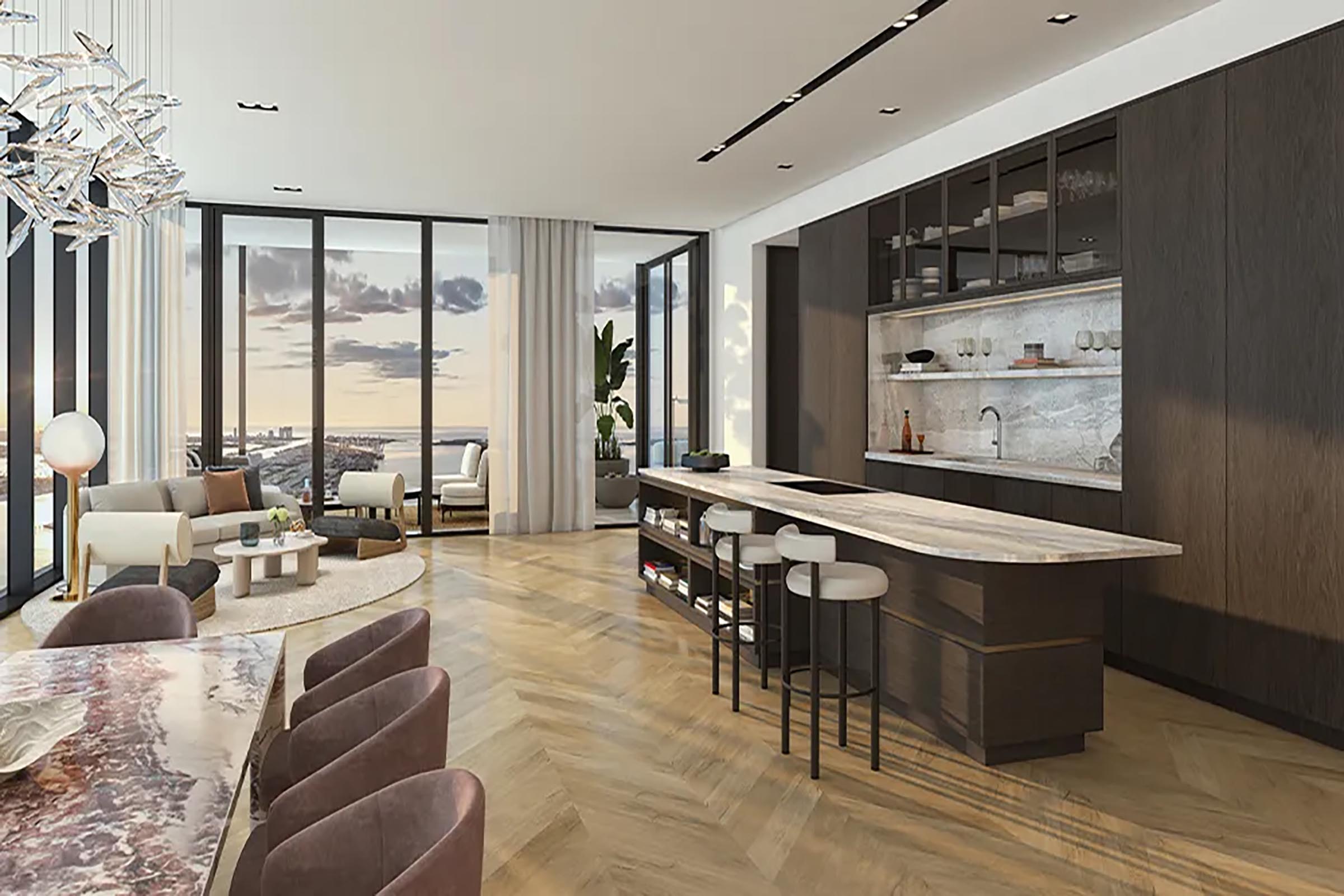Other features of the residences that stand out are drop-down televisions in every primary suite and since the building is constructed without exterior columns, the floor-to-ceiling impact windows envelope the entire home for an uncompromised view.