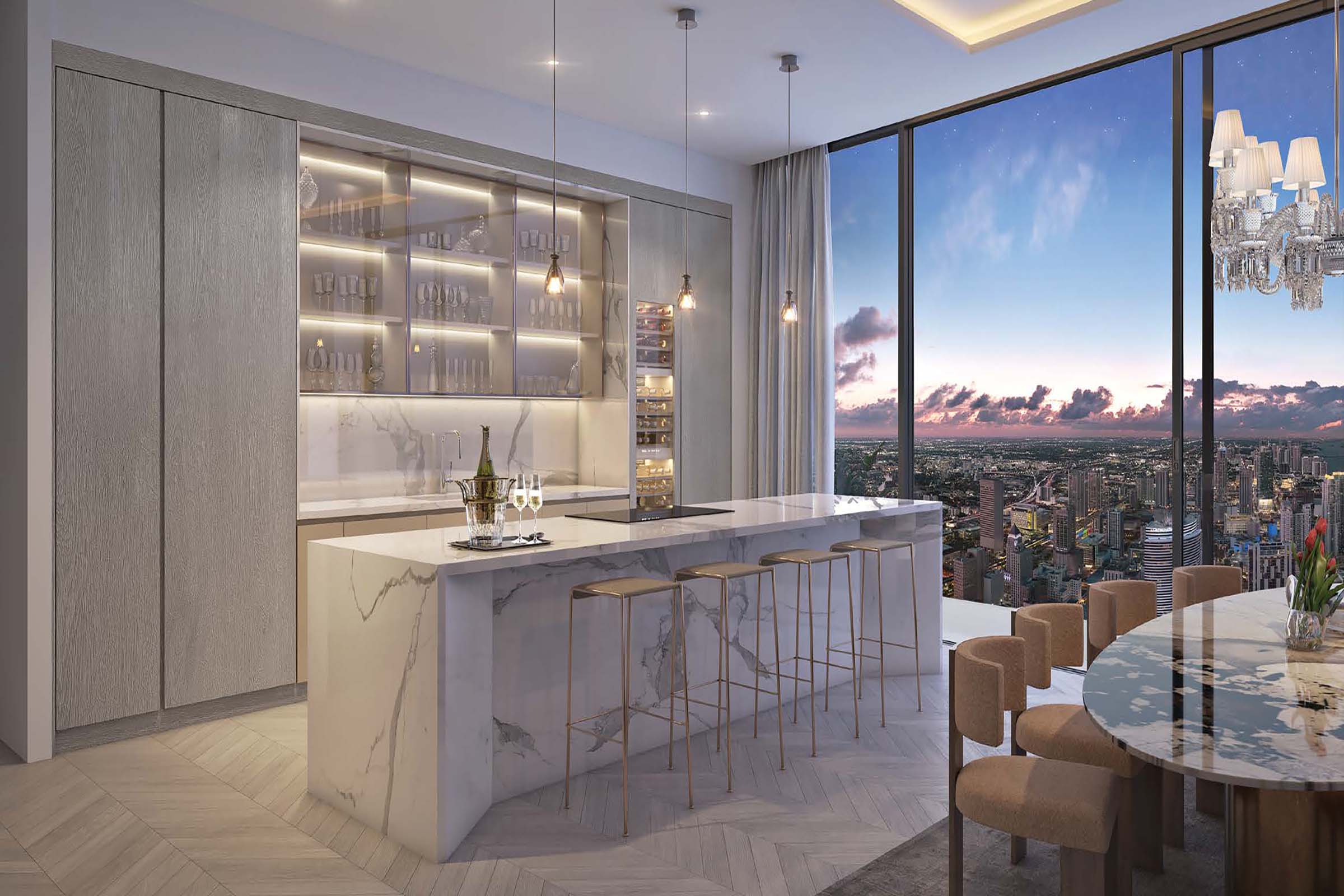 - Open-concept kitchens with chef’s island, custom Italian cabinetry designed by Meyer Davis and a pre-construction selection of finishes and choices of backsplashes and stone countertops