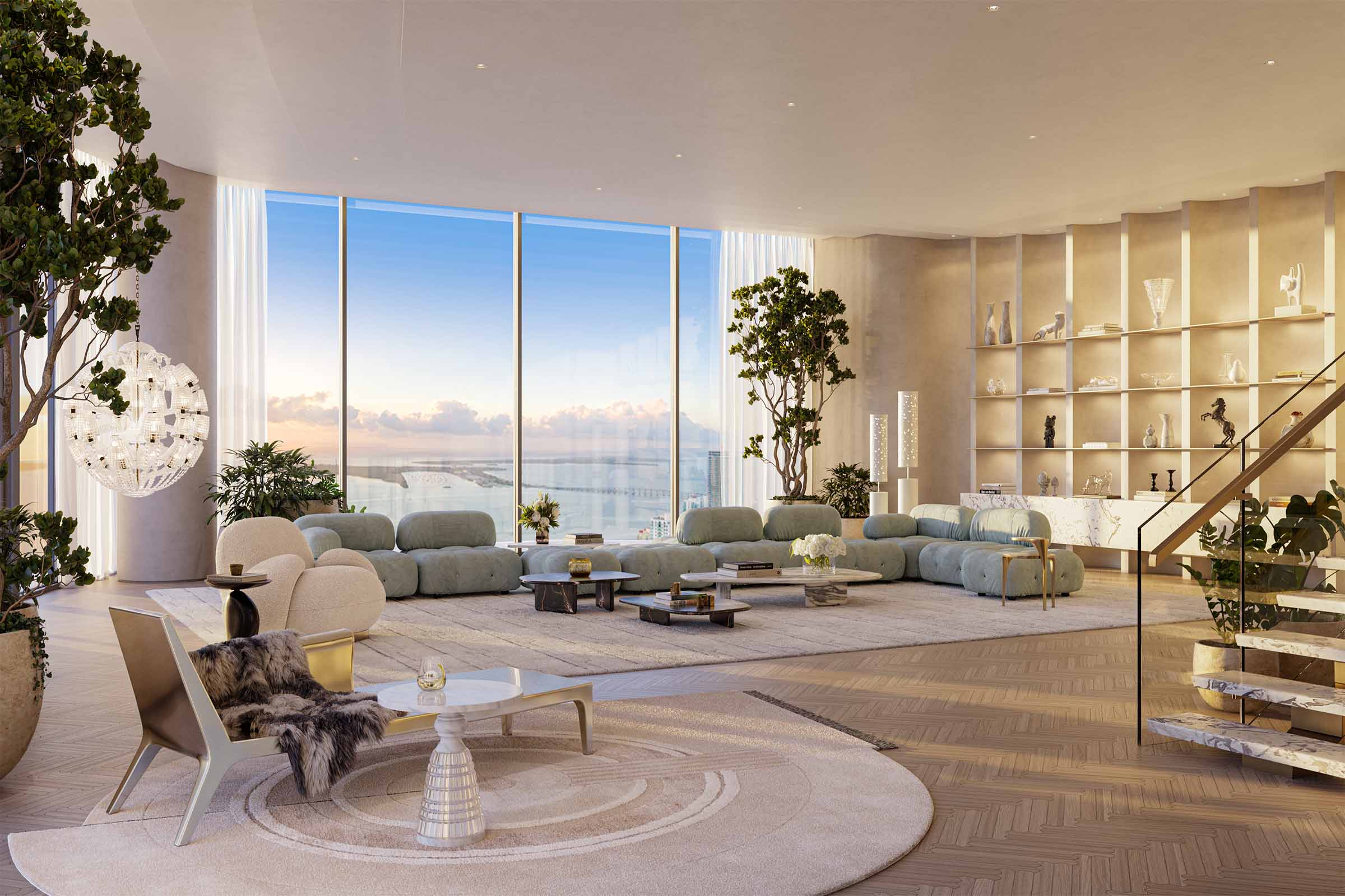 The tower residences also have limited availability ranging from $2.5 million for a 1 bedroom with a den on the 54th floor to $6 million for a combined residence on the 64th floor with 4 bedrooms. The price per square foot ranges between $1500 per square foot to around $1800 per square foot and all of the residences come with a view of the Miami River and/or the Biscayne Bay.
