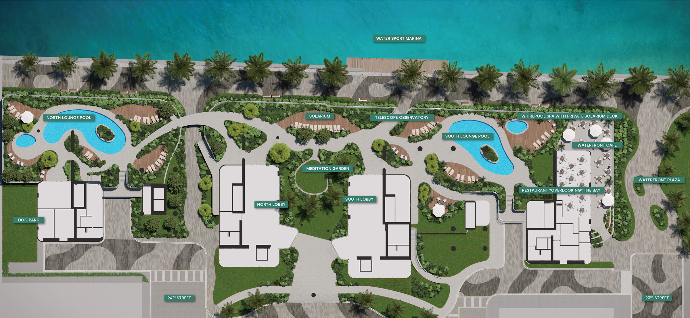 Aria Reserve will offer its residents extraordinary indoor and outdoor amenities. Outdoor amenities will include a water sports marina with paddle board and kayaking services, direct access to the Baywalk, semi-Olympic-size lap pool, lounge pool, poolside daybeds, children’s splash pad, hot tub, kid’s playground, dog park, miniature golf, tennis court, basketball court, paddleball court, telescope observatory area, meditation garden, BBQ with dining area, fire pit and valet parking. Indoor Amenities at Aria Reserve will include a Sky Lobby with lounge area, wine cellar room and business center, high-tech fitness center, yoga lounge, wellness spa, sauna, steam room, club room, kid’s playroom, movie theater, teen’s lounge/game room, restaurant overlooking the bay, café and 24-hour attended front desk.
