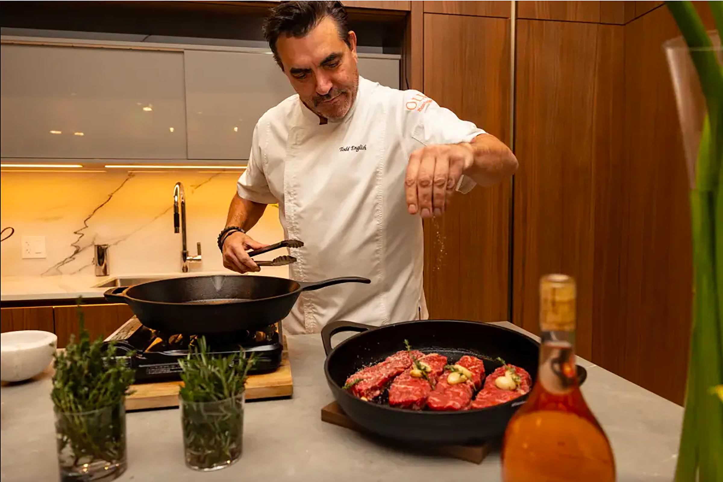 During the SOBEWFF, a private dinner was held for 150 guests to announce the new partnership between the ultra-luxury development and the four-time James Beard Award recipient. Celebrity Chef English took over the model kitchen in the development’s $10 million sales gallery to whip up a tasting of Australian Wagyu beef in celebration of his new post as the culinary director for the development.