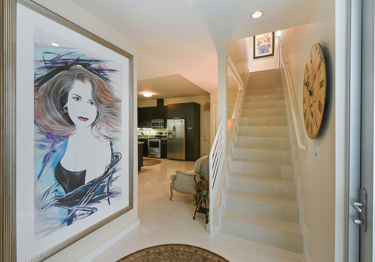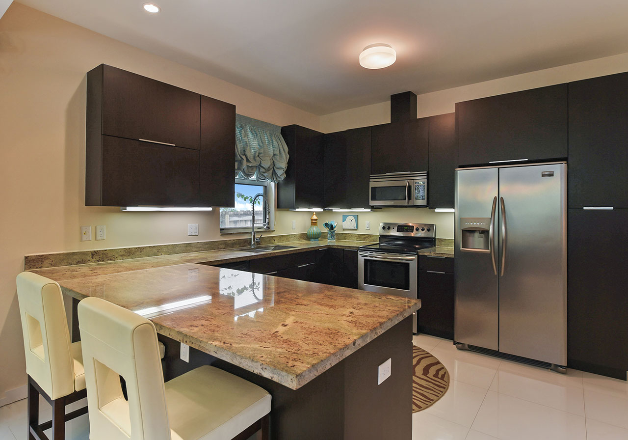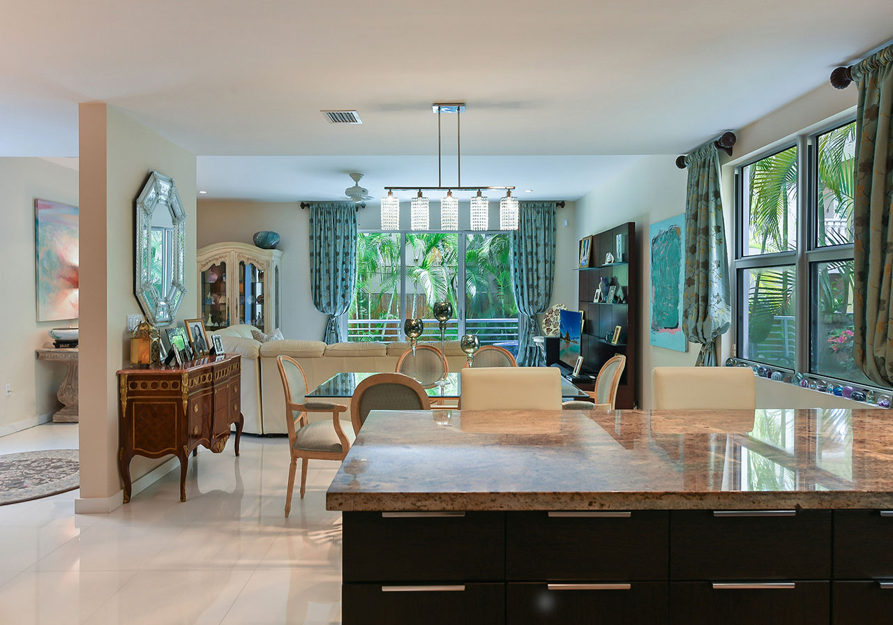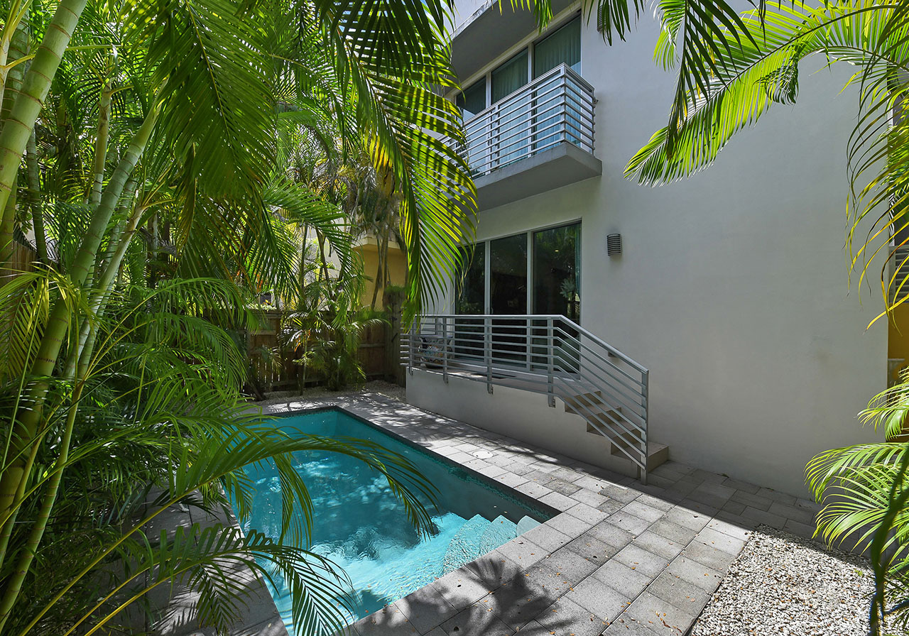 Built in 2009, this 3-story, 3-bedroom, 3.5-bathroom home offers 2,410 square feet of interior living space boasting 24″ white porcelain flooring and hurricane-impact windows and doors throughout. The main level features an open-concept kitchen with espresso cabinetry, granite countertops and stainless-steel appliances, dining room, powder room and an expansive living room overlooking the private pool surrounded by lush landscaping.