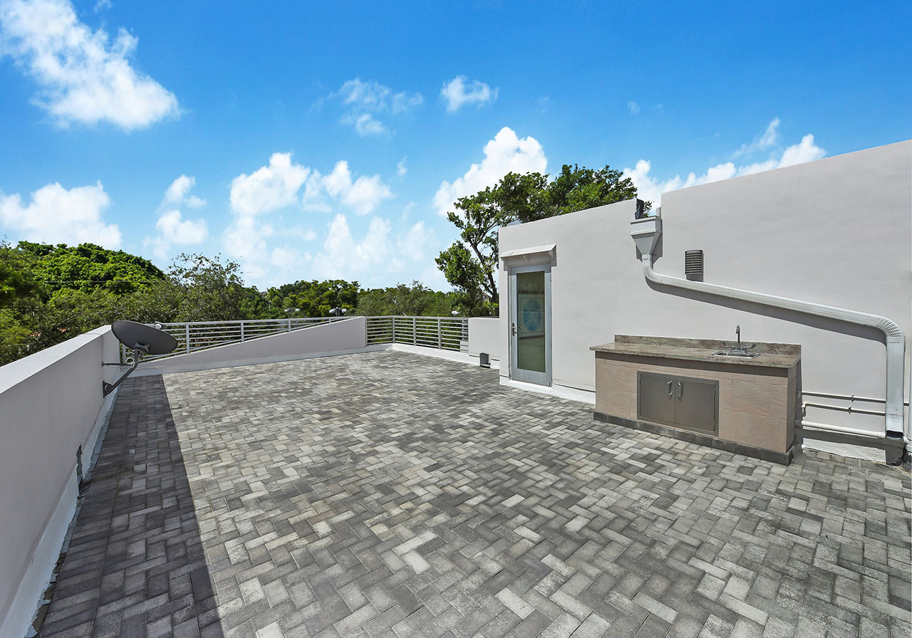 The 2nd level offers 3 bedrooms with ensuite bathrooms including the master suite boasting a large walk-in closet, private terrace overlooking the pool and bathroom with large dual sink vanity, marble countertops, glass-enclosed shower with marble wet walls and a separate water closet with bidet. A laundry room with full-size Whirlpool front-load washer and dryer completes the 2nd level. The 3rd level is a private, 1,200-square-foot rooftop terrace with a built-in sink and summer kitchen hookup.