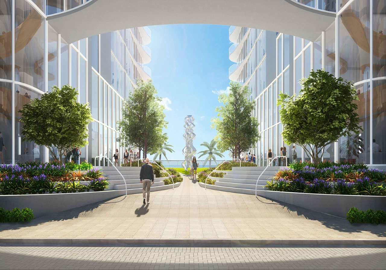 The Melo Group is proposing “Island Bay,” a mixed-use development consisting of two, 60-story towers offering 782 residential units and approximately 9,000 square feet of ground-level commercial space. The proposal also states that it will enhance the pedestrian experience in the neighborhood and utilize its bayfront location to enhance public access to Biscayne Bay.