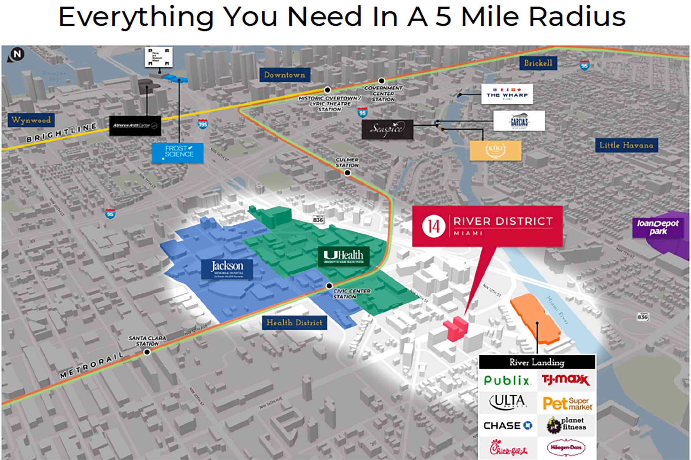 Adjacent to River District 14’s construction site is River Landing, a shopping center that offers a new Publix grocery, Pet Supermarket, fast food options including Chic Fila and Haagen Daaz, as well as Planet Fitness and retail shopping outlets. Nearby Metrorail Stations make commuting into Downtown Miami, Brickell, Coconut Grove and Coral Gables a breeze, which also brings up the proximity to the University of Miami (UHealth) Campus. Access to Miami International Airport is also a cinch on the Metrorail, or via car.