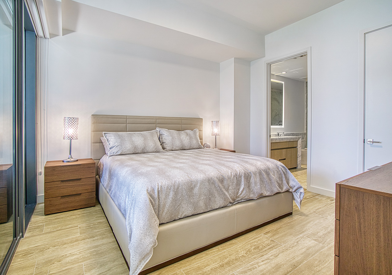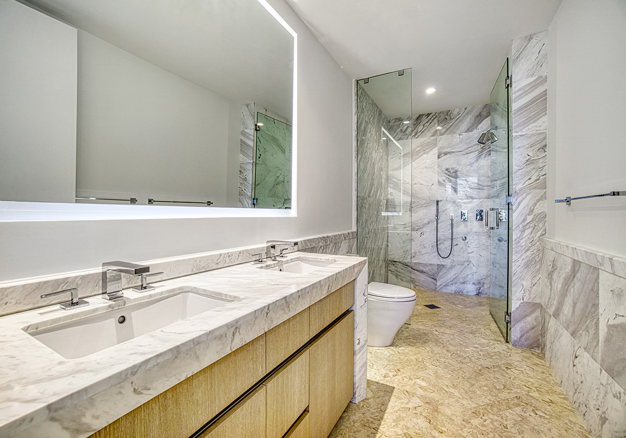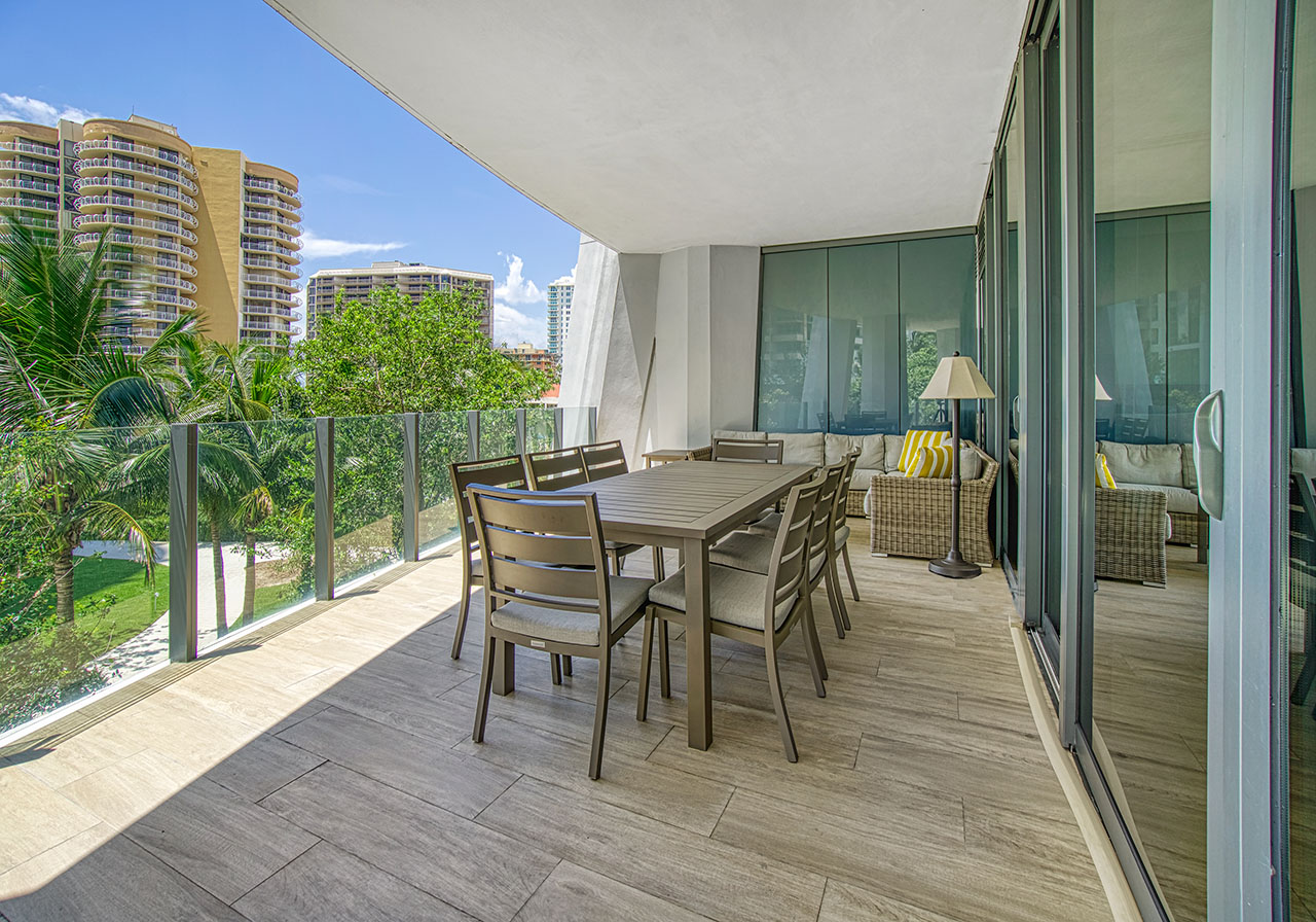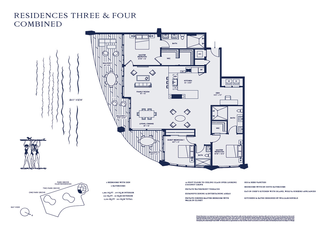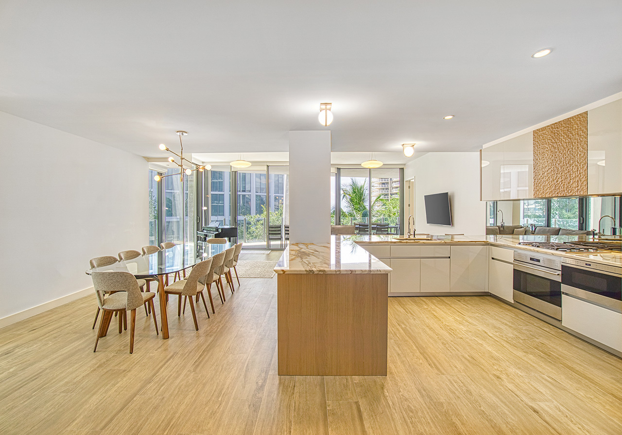 This stunning 3-bedroom + den, 3-full-bathroom condo offers 10-foot ceilings, floor-to-ceiling impact-resistant windows and sliding glass doors, custom lighting and beautiful wood-grained porcelain flooring throughout. This unit also features an open concept living area and dining room, an eat-in Chef’s kitchen designed by William Sofield boasting an island, Italian cabinetry, marble countertops, mirrored backsplash and top-of-the-line Wolf and Sub-Zero appliances, spa-like ensuite bathrooms also designed by William Sofield offering modern vanities, marble countertops, marble wet walls and herringbone shell stone flooring. This unit also offers an in-unit laundry room and 2 assigned secured parking spaces.