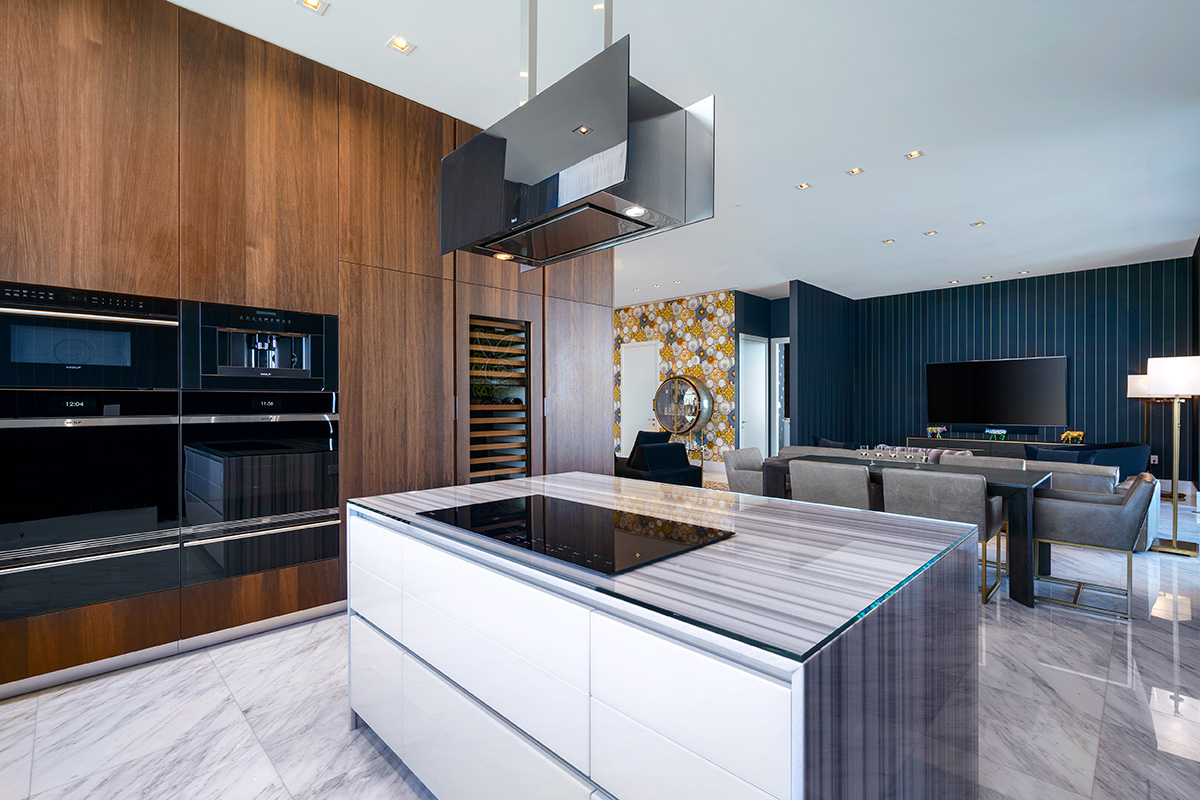 • Kitchen Features Dual Dishwashers, Dual Wall Ovens with Warming Tray and 132-Bottle Wine Refrigerator
