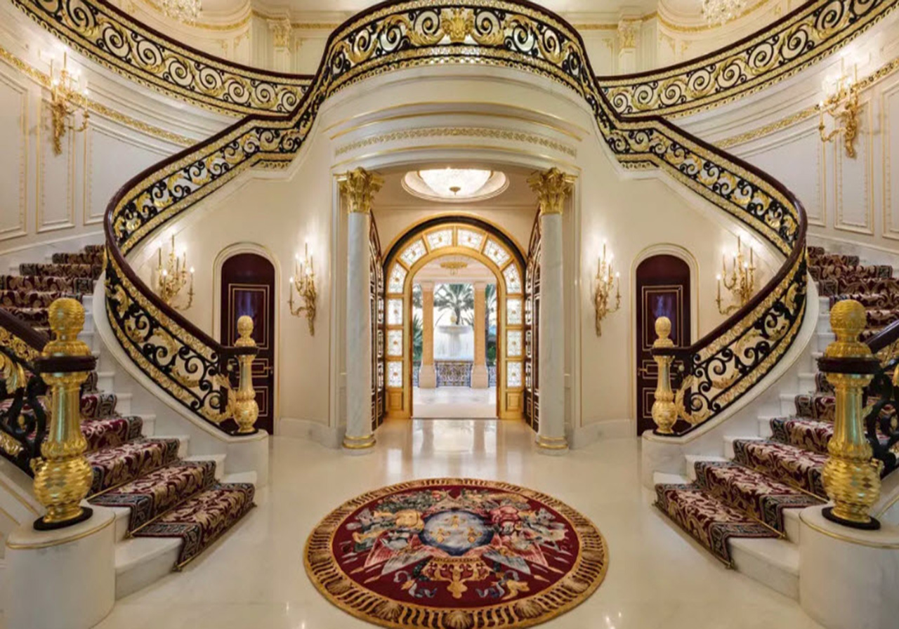 Designed by Miami-based architect Denio Madera, the beyond lavish mansion was inspired by the Palace of Versailles and other European royal palaces, hence the 22-karate gold leaf speckled throughout, and features 11 bedrooms, 22 bathrooms, a $2 Million marble staircase, a private 18-seat IMAX home theater with a 50-foot-wide screen, a 30-car garage, putting green, multiple pools including a 4,500-square-foot infinity-edge pool, 6 fancy waterfalls and 2 deep water docks. The elaborate home also boasts a highly-sophisticated security system and was insulated with marble floors imported from South Africa to ensure complete soundproofing, specifically to mute the clacking of high heels.